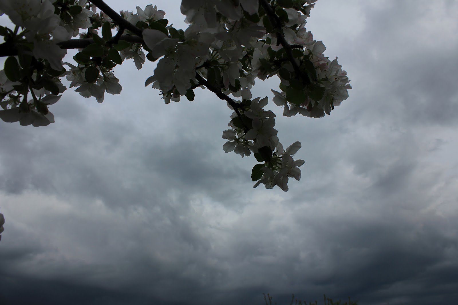 Я постаралась передать всю красоту момента перед грозой. Как ярко смотрелись цветущие деревья на фоне синего неба, какой сочной была трава под огромными тёмными тучами, тюльпаны словно загорелись, а небо будто опустилось до земли. Должно было что-то случиться. Я ожидала чего угодно, даже смерча. И вот... сильнейшие раскаты грома, ливень, град...